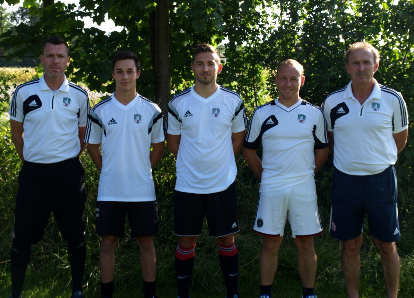 Trainer Adrian Klein mit Neuzugängen Felix Aichhorn und Tom Loferer, Trainer Zweite Martin Meier und Abteilungsleiter Fußball Georg Klauser